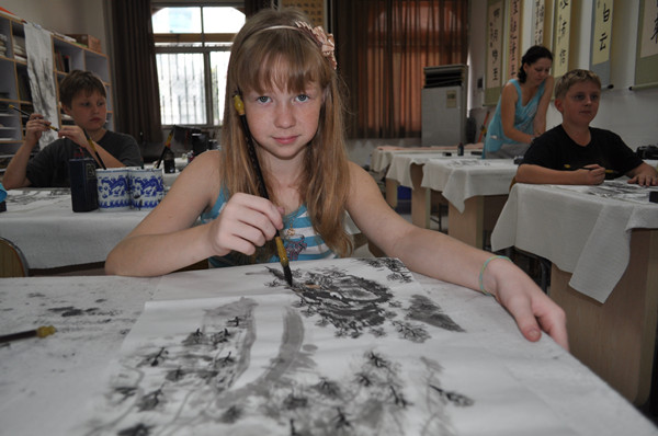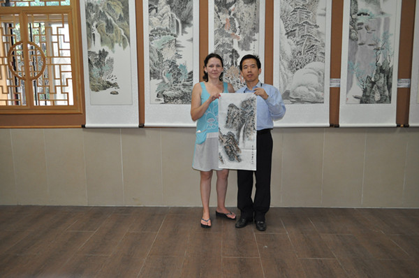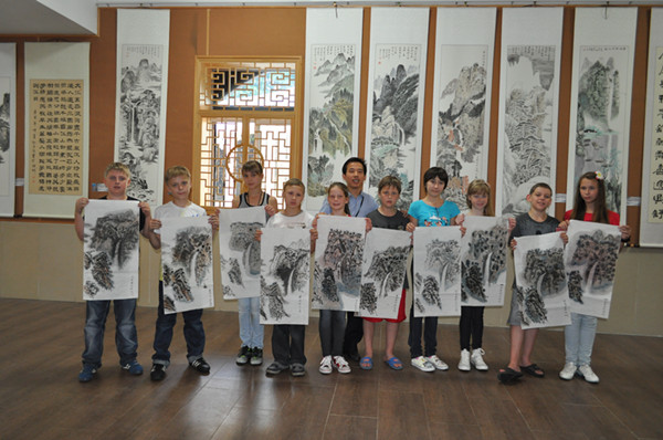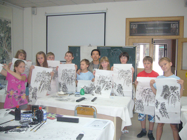 这让我想起了金庸先生笔下的人物——《倚天屠龙记》里的明教高手之一、四大护教法王之紫衫龙王就是一个外国人,其中国功夫练得炉火纯青,而且叫绝的是紫衫龙王(也就是金花婆婆)的看家本领居然是暗器。暗器是最具中国特色的吧,哈哈,可人家一个外国人却能练得这么好,真是想不通啊!看了这帮俄罗斯学生画的中国山水画作品后,我的解析是俄罗斯的风景油画举世闻名,他和中国山水画有其相通之处,所以,这帮俄罗斯学生能在短时间内画出中国山水画的神韵的诠释吧。