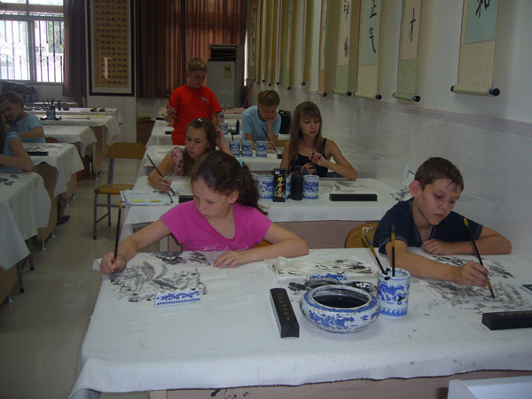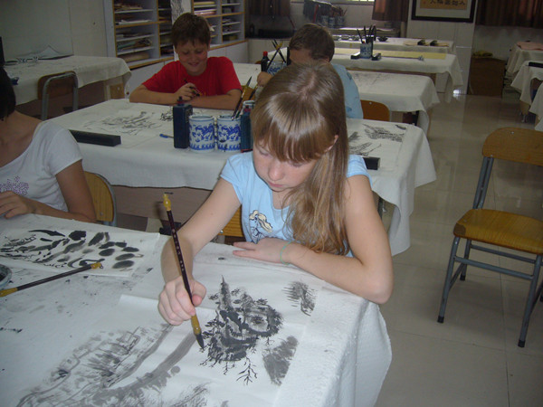 当国际部陈校长带着这帮老外进到我的书画室时,我不禁眼前一亮,带队的老师是一位漂亮的洋妞。而且会说一口流利的中文。第一节课先让这些洋学生简单了解中国画的工具、材料,然后简单的用毛笔画了线条、形状之类的。本来只想教他们简单的画一下花啊草呀的。但是带队的美女老师看了我的山水画以后,提出要求,要学画山水画,我的妈呀,真是不知天高地厚呀。山水画岂能短时间就能学会的,但是禁不住美女教师的央求,偶还是答应了。