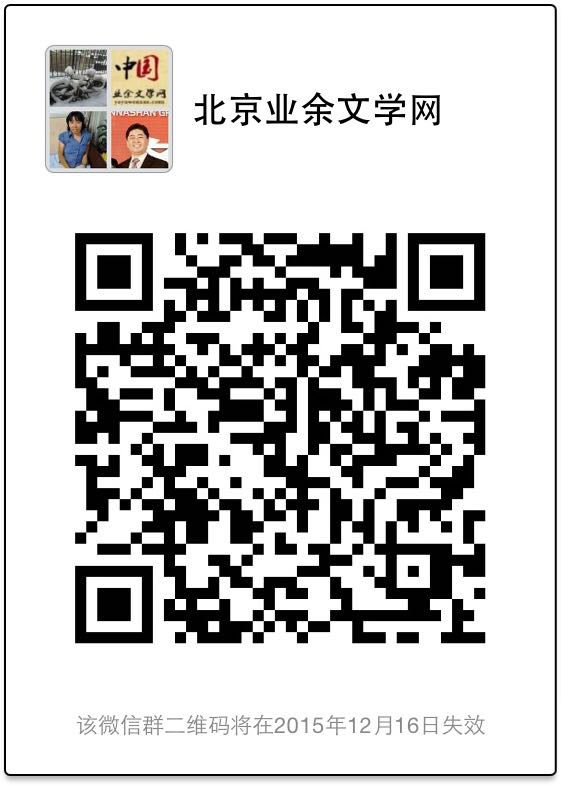 为方便北京的文友及时的交流,形成良好的学习和交流的氛围,特决定成立北京业余文学网微信群,请大家扫描以下二维码加入业余文学网群,谢谢!